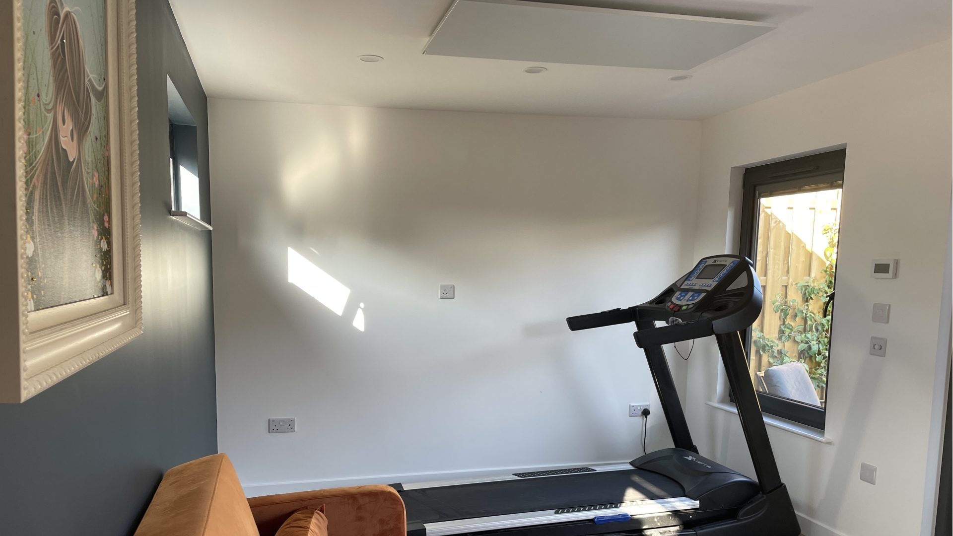To maximise wall space, the room is heated by ceiling-mounted Infrared panels which, instead of directly heating the air in a room, heat the walls, ceiling and floor evenly which absorbs the heat and gently re-emits it back into the room. This is more efficient than conventional heating systems which waste energy by heating large volumes of air.